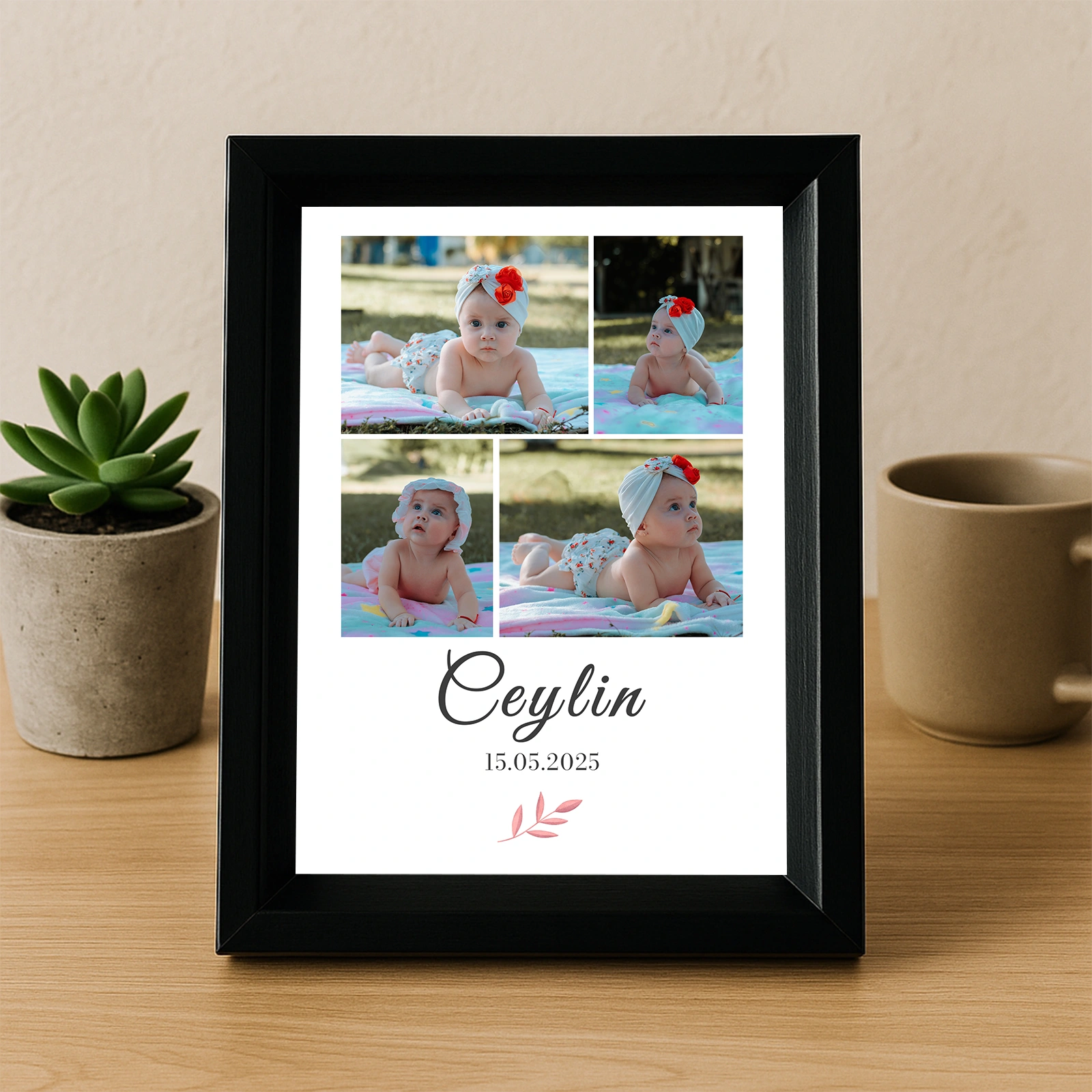 Bebeğinizin en tatlı anılarını bir arada sergileyebileceğiniz bu özel 4 fotoğraflı kız bebek çerçevesi, 15x21 cm ölçüsünde olup tamamen kişiselleştirilebilir. Üzerine bebeğinizin ismi ve doğum tarihi eklenerek eşsiz bir hatıraya dönüşür. Kız bebek odalarında şık bir dekoratif parça olarak kullanılabileceği gibi, doğum, baby shower, hastane çıkışı, ilk yaş günü gibi özel günlerde sevdiklerinize anlamlı bir hediye seçeneği sunar.