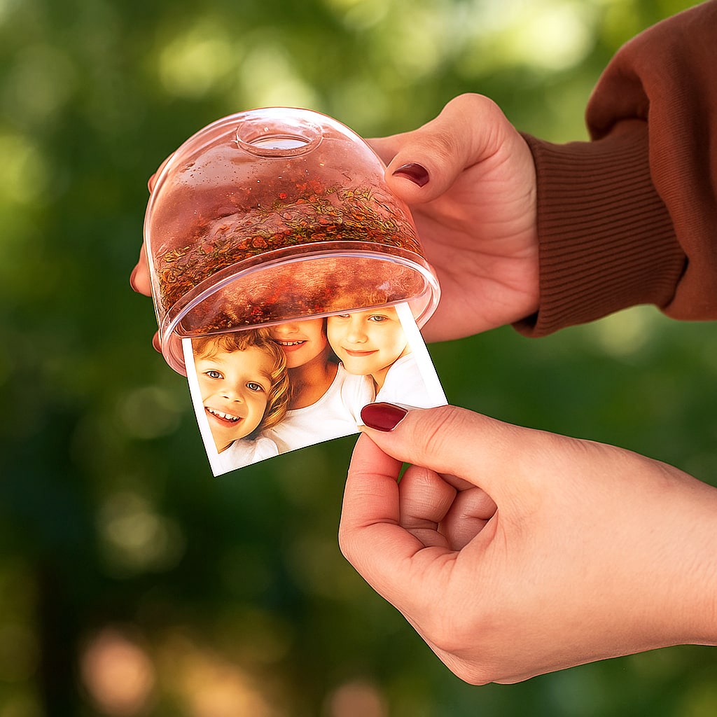 *Bu zarif kar küresi, içine yerleştirilen iki özel fotoğrafla sevdiklerinize hem nostaljik hem de duygusal bir sürpriz sunar. Her sallandığında etrafa saçılan simli ışıltılar, hediyeye büyülü bir hava katar.